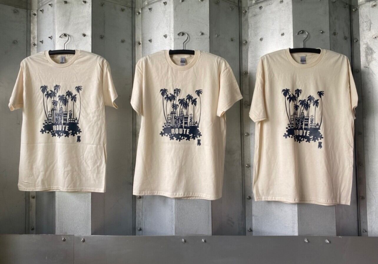 パームツリーを並べ、ストリート感を出すためにビルを建て、下にはROUTEのポイントであるパズルのピースを散りばめ、右下には可愛らしくROUTE DOGがいます!!